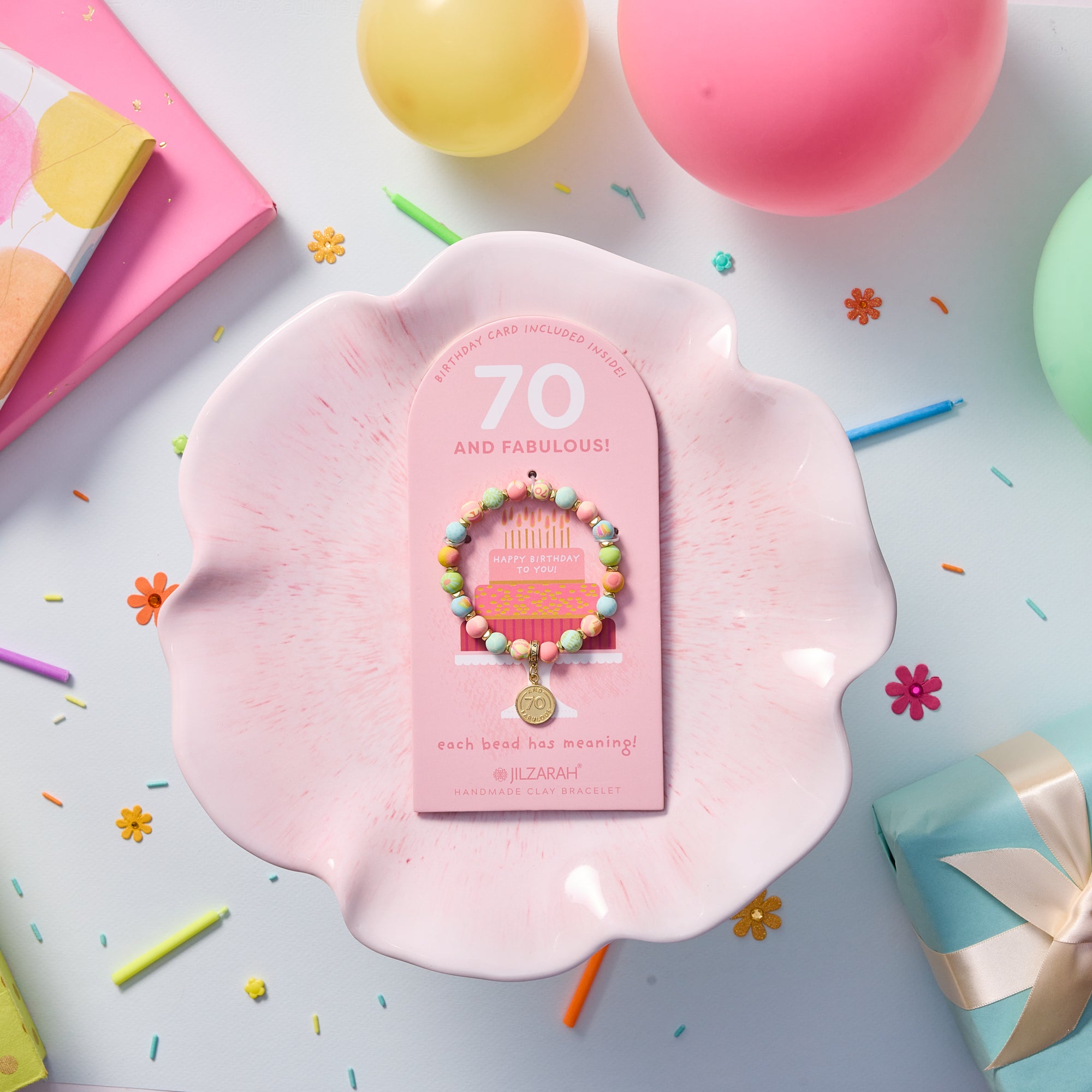A vibrant collection of handmade clay beaded bracelets for milestone birthdays 40, 50, 60, & 70, plus two joyful styles for any birthday! Each comes with a cheerful insert card highlighting the perks of each new decade and space for a heartfelt message.
