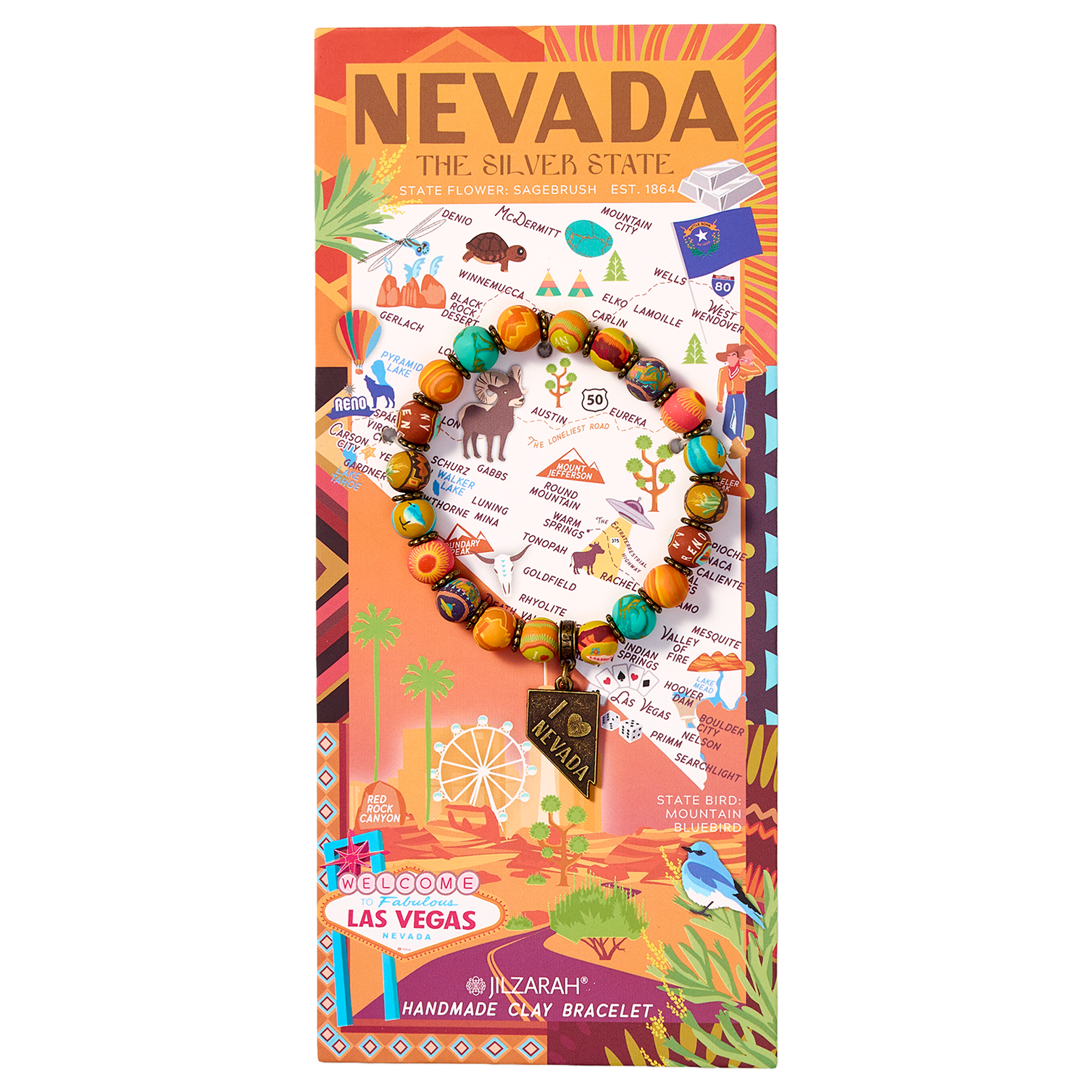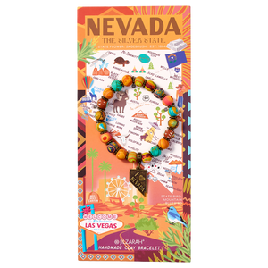 Celebrate The Silver State with this beaded bracelet, featuring rich shades of golden bronze, vibrant rose, and radiant sunshine yellow that reflect the diverse beauty of Nevada. From the sunlit Valley of Fire to the mystery of Area 51, this bracelet embodies the spirit of adventure and the stunning landscapes of the Silver State.