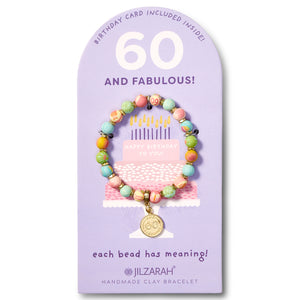 A vibrant collection of handmade clay beaded bracelets for milestone birthdays 40, 50, 60, & 70, plus two joyful styles for any birthday! Each comes with a cheerful insert card highlighting the perks of each new decade and space for a heartfelt message.