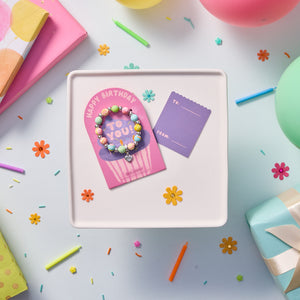 Handmade clay beaded bracelets designed for ages 3 to 10, plus a special birthday style for any age! Each bracelet features celebratory bead patterns and includes a personal message card crafted with love to mark their special day.