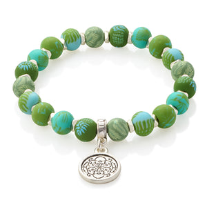 Dainty 8mm clay beads, laced together with delicate spacers and topped off with our blossom coin charm.