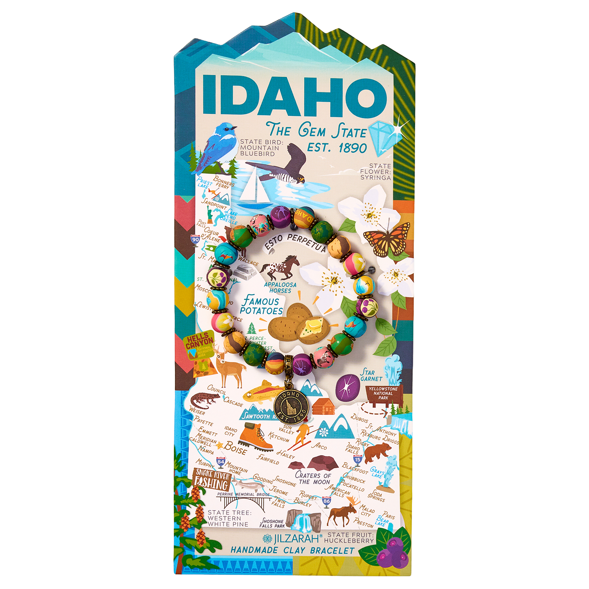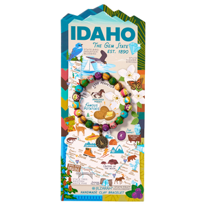 Inspired by The Gem State, this beaded bracelet captures Idaho’s rich landscapes and natural beauty. Earthy browns reflect the rugged trails of the Sawtooth Mountains and the strength of the Appaloosa horse, while golden hues pay tribute to the state’s fields of wheat and famed potatoes. Vibrant blue accents mirror the brilliance of the Mountain Bluebird and the crystal-clear waters of Idaho’s alpine lakes, creating a piece as diverse and captivating as the state itself.