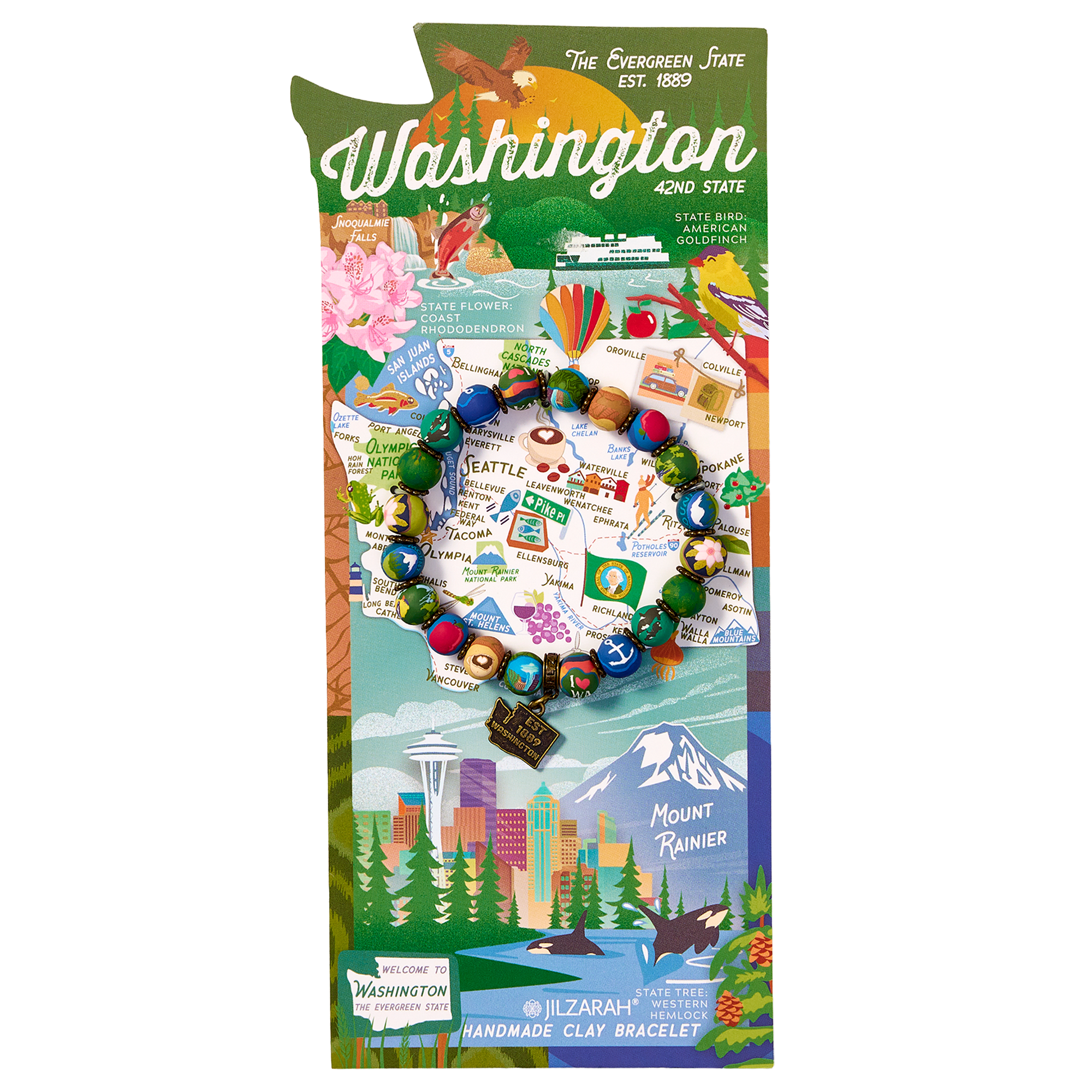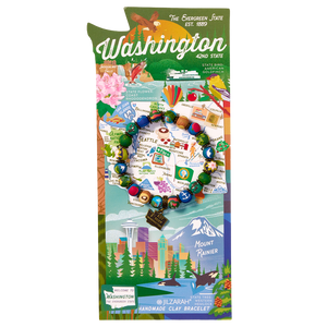 Embrace the natural beauty of The Evergreen State with this elegant beaded bracelet, featuring pure white, lush pine green, and sunny gold. Each bead evokes the spirit of Washington, from the iconic Mount Rainier & Puget Sound to the rich coffee culture and vibrant Pacific Rhododendron, capturing the essence of this diverse and breathtaking region.