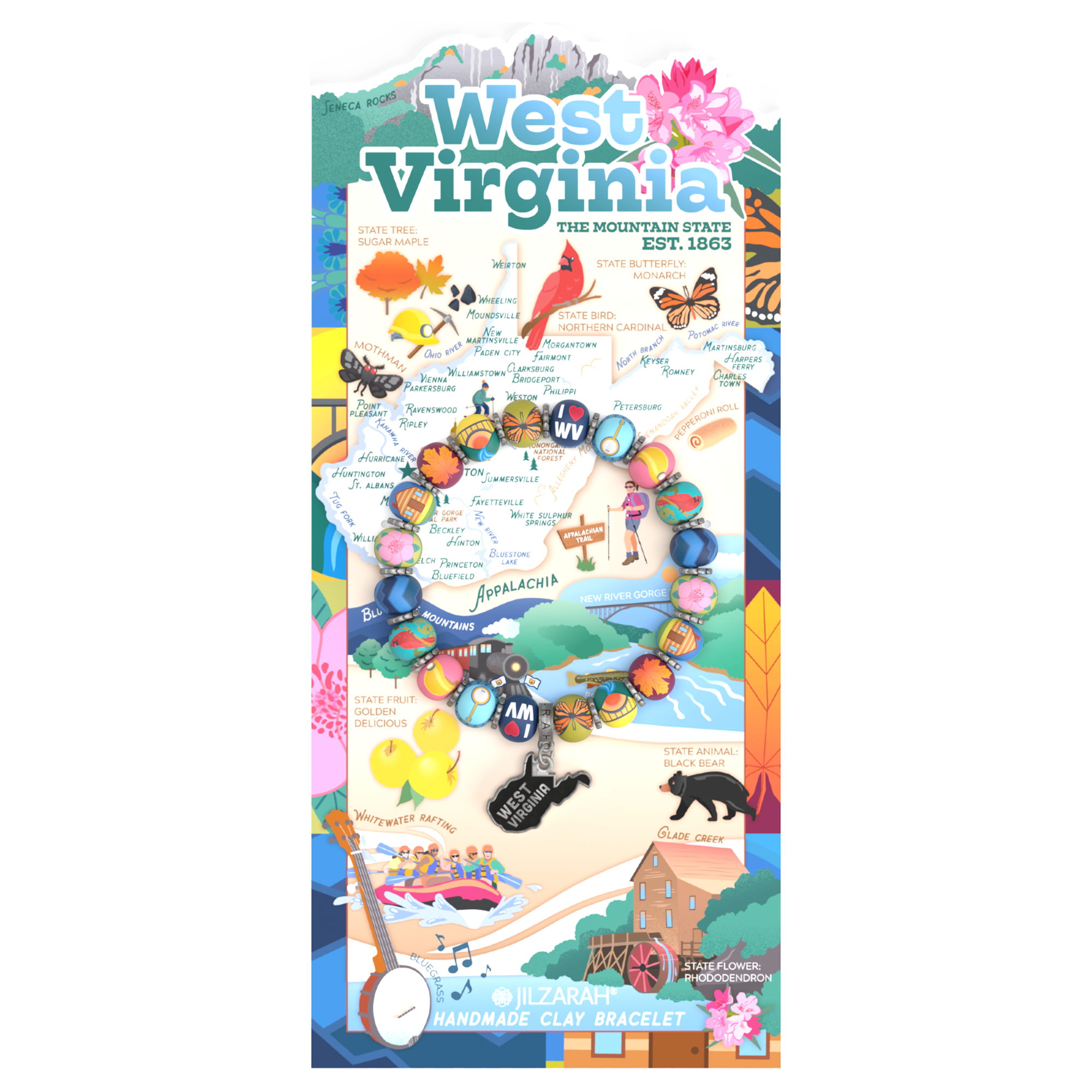 Wear a love note to The Mountain State—handmade beads that cheer “I ♥ WV,” span the New River Gorge Bridge, and wander through Appalachia with banjos, cardinals, and coal country grit. Deep mountain teal, airy sky blue, and soft rhododendron pink ripple around your wrist like ridgelines at sunrise. Sugar maple leaves, monarch wings, and the state flower bloom between every bead, inviting stories of hikes, hollers, and home. Gift it, collect it, and let West Virginia’s bluegrass heartbeat travel with you.