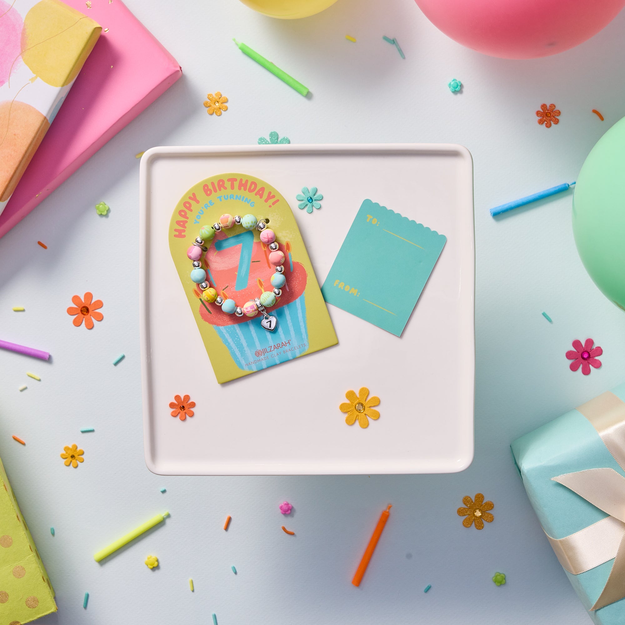 Handmade clay beaded bracelets designed for ages 3 to 10, plus a special birthday style for any age! Each bracelet features celebratory bead patterns and includes a personal message card crafted with love to mark their special day.